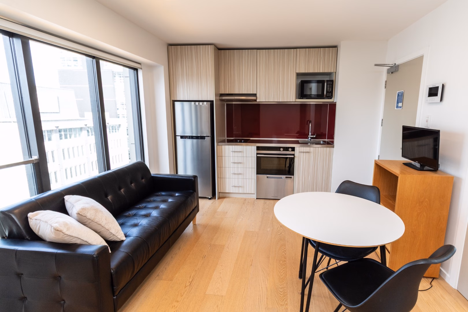 This furnished, modern studio is located on the tenth floor with large windows that get loads of natural light and sun throughout the day.