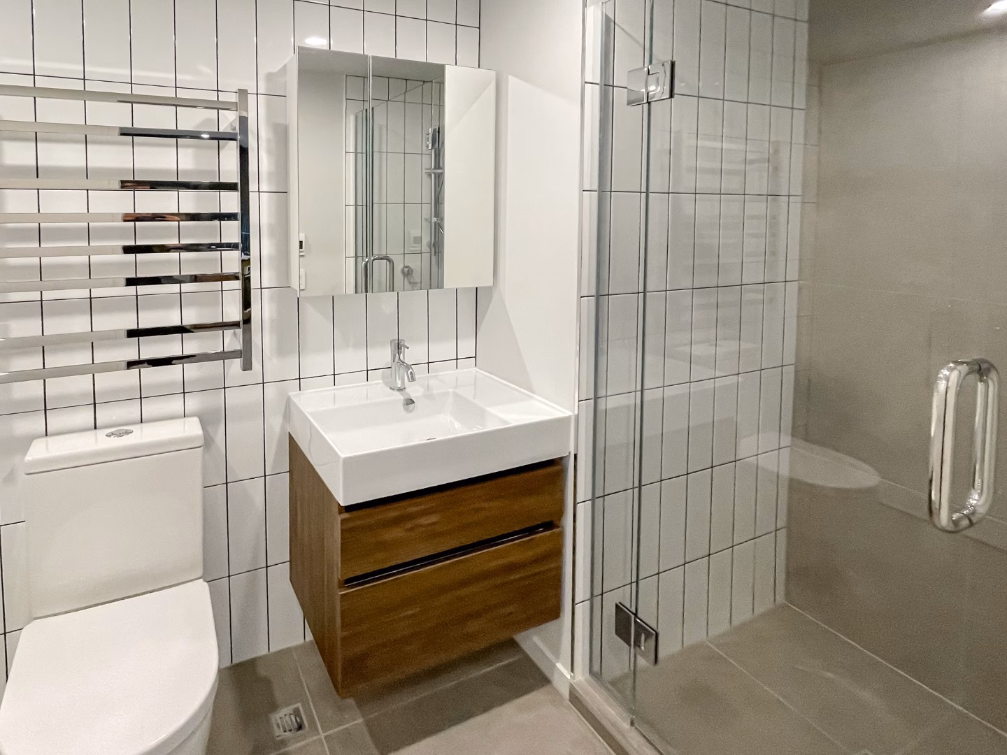 Enjoy a stylish and sophisticated bathroom with a heated towel rail, underfloor heating, and a generous laundry area.
