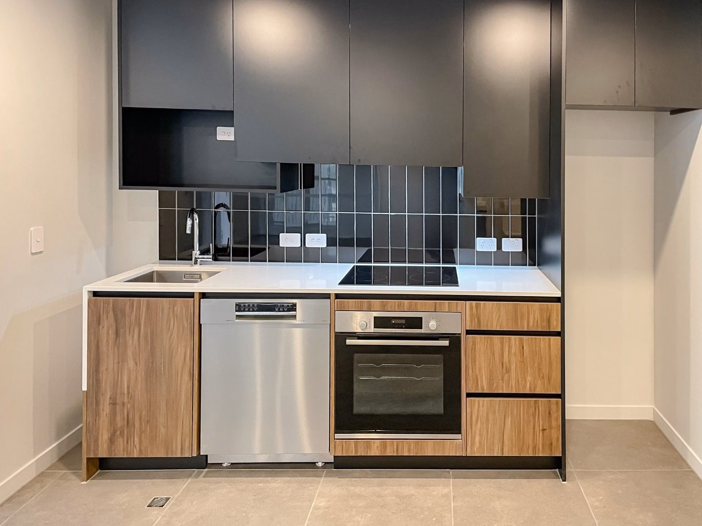 The kitchen’s pièce de résistance is the half waterfall stone benchtop, exuding sleek and stylish sophistication.