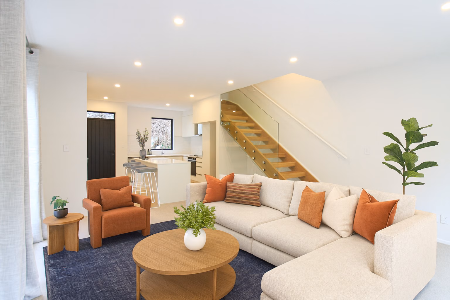 – Modern open-plan kitchen, featuring sleek stone island waterfall bench top counter