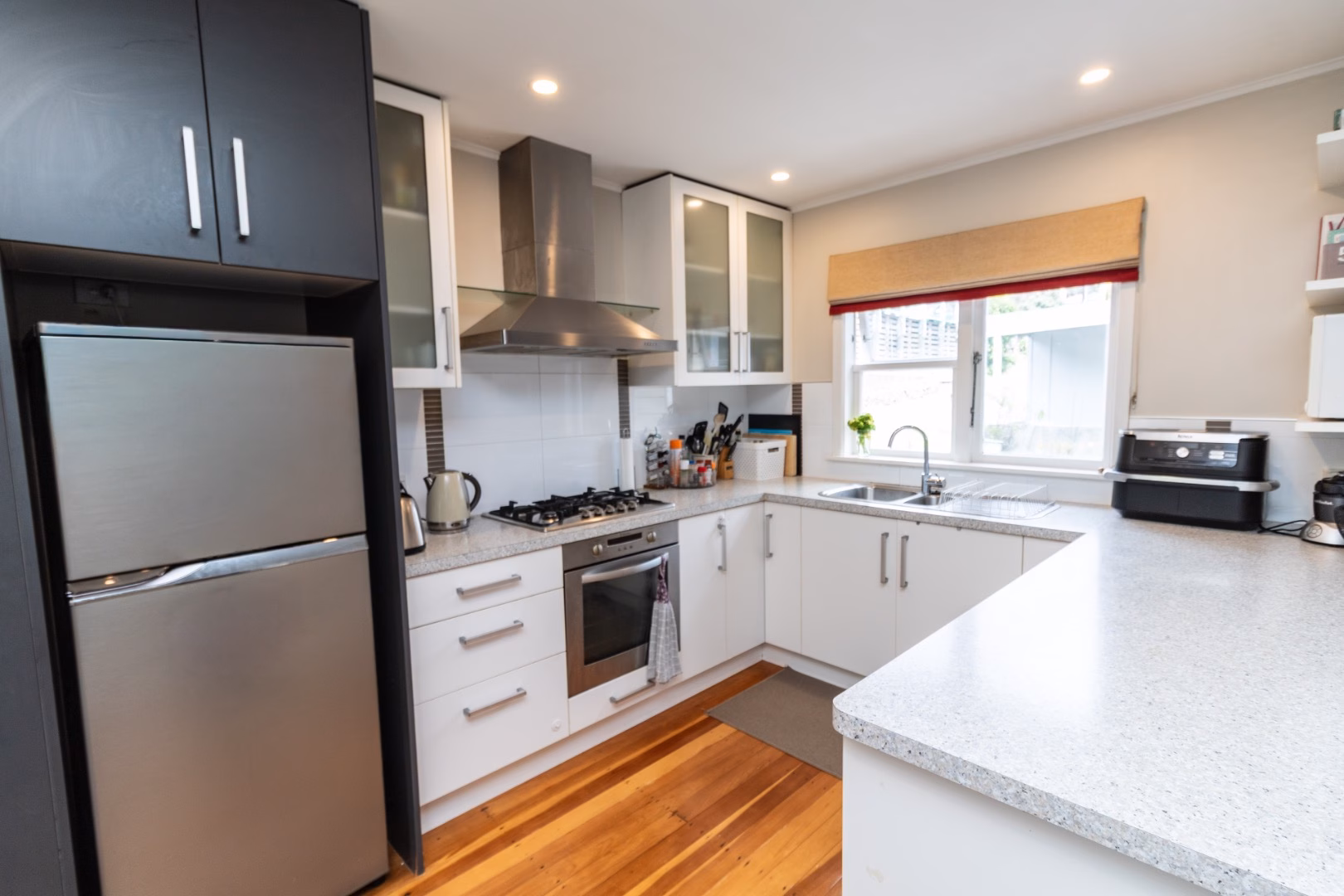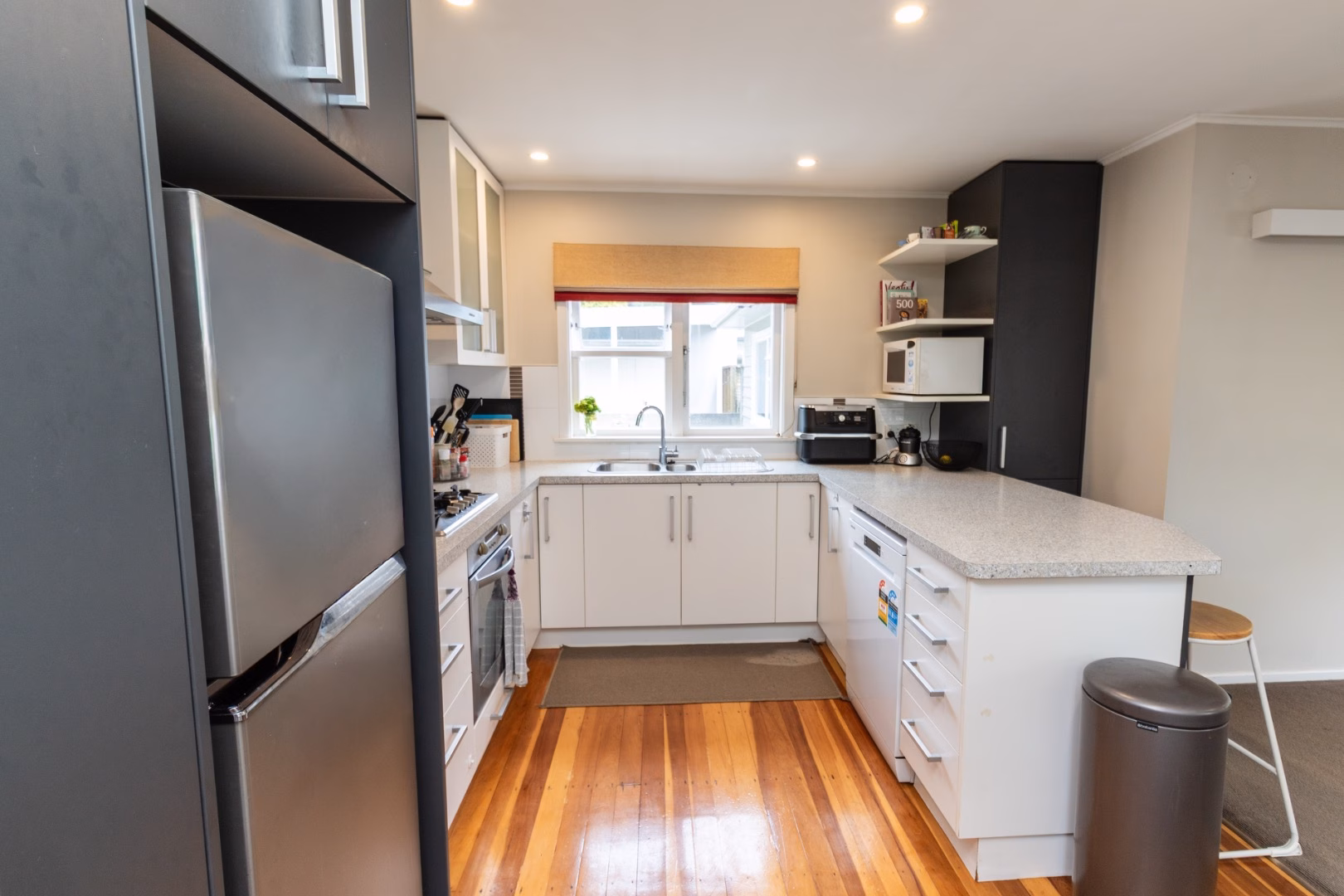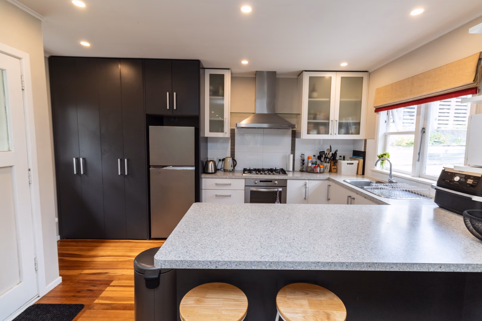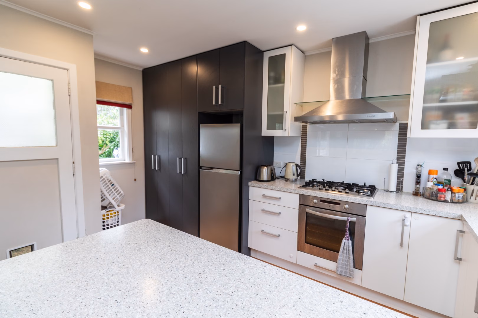– modern kitchen with plenty of storage, laundry cupboard, and a breakfast bar