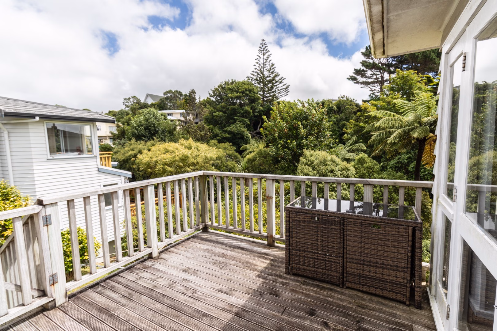 – French doors open from the lounge onto a sunny deck with steps down onto a private lawn