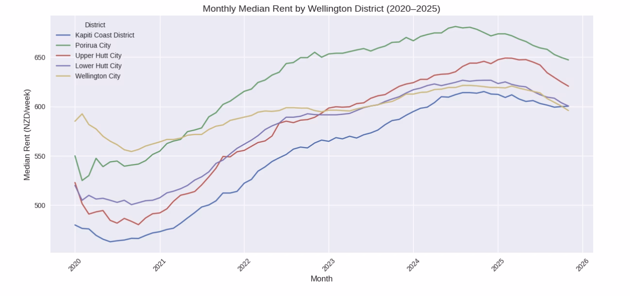 Figure 3: Wellington region rent trends by district (2020–2025)