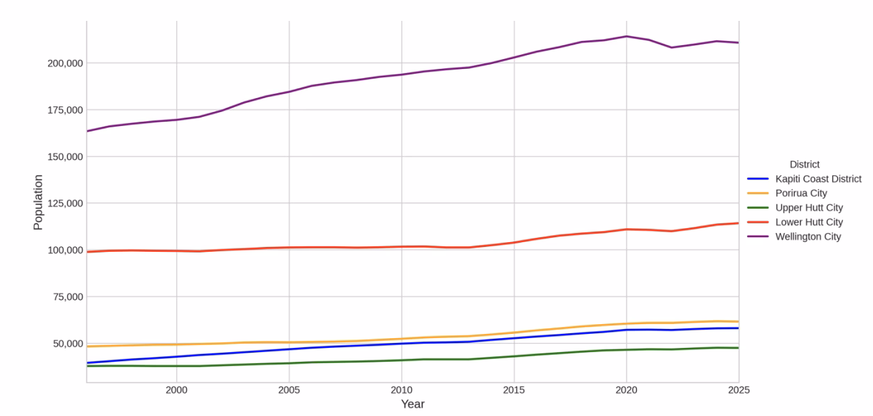 Wellington City remains the region’s population heavyweight at around 200,000 residents – approximately double the size of Lower Hutt. But it is no longer the dominant growth engine.