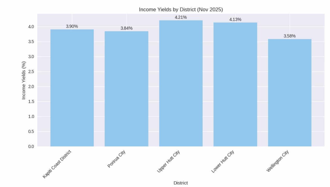 The standout figure: Lower Hutt now delivers the strongest rental yield in the western Wellington region at 4.21%, outperforming Wellington City at 3.58%.